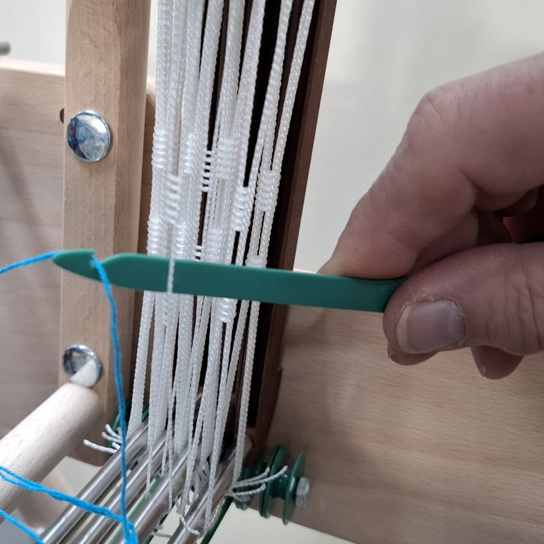 A convenient hook for threading your rigid heddle or shaft loom with ease.